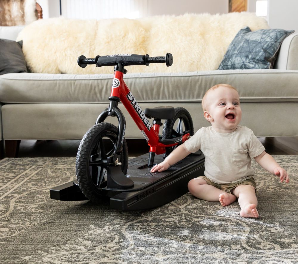 Los bebés (sí, dijimos bebés) pueden comenzar jóvenes ajustando el asiendo Strider a la altura más baja. Podrán pararse en la base para comenzar a balancearse y luego montar la bicicleta.